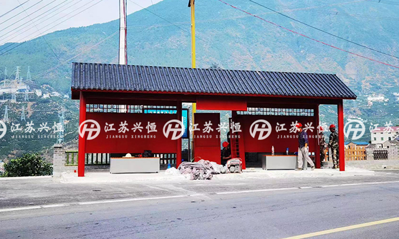 近期,湖北宜昌的客戶在我司訂購了一批仿古式候車亭,經(jīng)過數(shù)日的緊張施工,這批候車亭已經(jīng)制作完成并陸續(xù)發(fā)往宜昌,從當(dāng)?shù)厥┕し桨l(fā)來的圖片可以看到,部分候車亭已經(jīng)安裝完畢并投入使用。紅色的候車亭佇立于山水之間,巧妙的與周圍風(fēng)景融合一體,營造出翠綠山水之間一抹紅的自然風(fēng)光。
