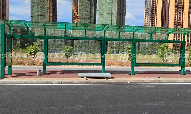 該款候車亭總長為12米,表面采用高溫氟碳烤漆技術(shù)處理,整體顏色為深綠色。候車亭頂棚為8mm熱彎鋼化綠玻(底全貼防爆膜),視野通透的同時也可以避免紫外線對人們的直射。該候車亭的凳子用材區(qū)別于常規(guī)的鍍鋅板凳子,采用的是麻灰油麻石凳,極具特色。