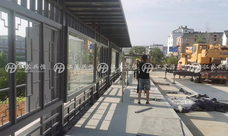 近期由江蘇興恒公交候車亭生產(chǎn)廠家制造的仿古候車亭于浙江衢州亮相。從現(xiàn)場安裝工作人員發(fā)來的照片可以看到,該批候車亭即將安裝完畢。