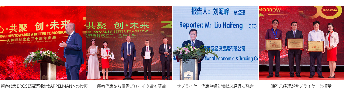 祝典には、天和磁材30周年祝典に出席いただいて御來賓の皆様方に対して熱烈な歓迎と衷心よりの感謝の意を心から表すると袁文杰董事長から挨拶しました。政府の支持、得意先及び供給會社からの信頼のおかげで、天和磁材はここまで発展しつづきました。三十年以來、天和磁材は信望が企業(yè)生存の基本と信じ、約束を守り、約束を果たすの原則を堅持しております。これからの未來にも、天和磁材は誠実重視、ユーザー至上という趣旨で、優(yōu)良な品質(zhì)で生存を求め、イノベーションで発展を探るとの方針で、業(yè)界リーダーとして、マグネットの前進技術(shù)を開拓していきたいと思っています。工程技術(shù)と配合法を改善しつづ、管理システムの完備を強化します。品質(zhì)を保證する同時に、最大限度的コストダウンします。 皆様方と協(xié)力し合い、共に成長していくことを望んでいます。