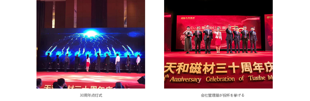 雨風に負けず30年、支えてくれた政府の方々、顧客、サプライヤー、各界の友、そしてまじめに働く天和従業(yè)員に感謝します。総経理の陳雅は各界の代表と祝賀會の點燈式を開きます。會長の袁文杰は、會社管理層、株主代表を乾杯の音頭で天和磁材創(chuàng)立30周年を祝う。
