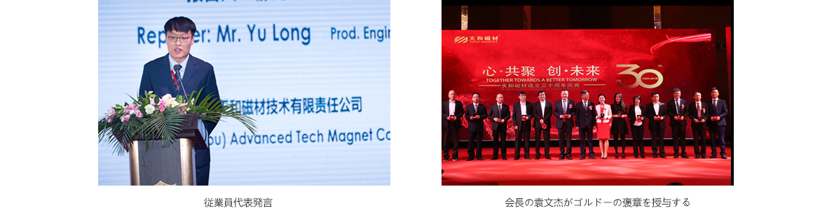 天和磁材が今の成長は、従業(yè)員全體の伝承と獻上のお陰です。その中、古い従業(yè)員長い間の堅持に関わらず、新しい従業(yè)員の努力も不可欠です。天和製造部エンジニアの郁龍が従業(yè)員代表のスピーチをして、「このような鋭意進取で穏やかで快適な家族のような會社で働いていることを誇りに思います」と表れました。30年相攜える天和の企業(yè)文化が一人一人の従業(yè)員を深く勵まし、夢を追い続けていくことにパワーをあげる。會社は従業(yè)員のプラットフォームと機會を與えて、みんなは必ず全力を盡くして、信頼を背かず、會社の「安全、奮闘、革新、誠実、責任」の価値観を伝承し続けて、発揚します。また、優(yōu)秀な従業(yè)員に貢獻することに感謝するため、會長の袁文杰がゴルドーの褒章を授與し、激勵する。
