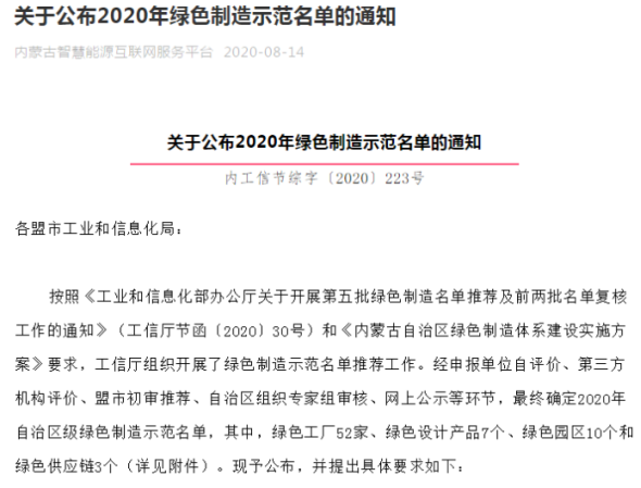2020年工業(yè)情報化省は“第五次グリーン製造者名簿”を公示し、內(nèi)モンゴル自治區(qū)は“グリーン製造模範(fàn)企業(yè)名簿”を公示しました。その中で當(dāng)社は工業(yè)情報化省の“グリーン工場”と自治區(qū)の“グリーン工場”とをそれぞれの認(rèn)定を取得しました。