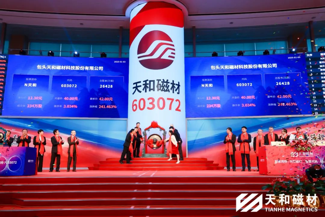 2025年1月3日、包頭天和磁材科技股份有限公司(証券コード603072)は正式に上海証券取引所メインボードに上場し、國內(nèi)メインボード資本市場における新年最初の上場企業(yè)となりました。內(nèi)モンゴル自治區(qū)、包頭市、レアアースハイテクパークの関係指導(dǎo)者、主要株主、ビジネスパートナー、仲介機(jī)関、天和磁材の経営陣及び従業(yè)員代表がこの輝かしい瞬間を共に見證しました。