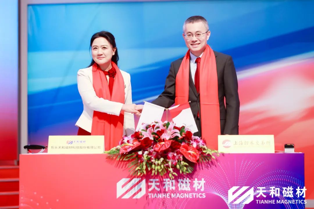包頭天和磁材科技股份有限公司の陳雅社長と上海証券取引所の王泊副総経理が「証券上場契約書」に調(diào)印しました。